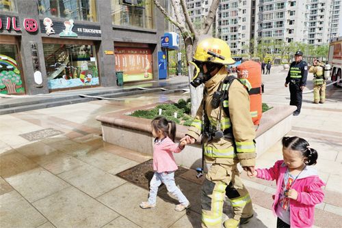 圖為消防員護(hù)送小朋友離開救援現(xiàn)場