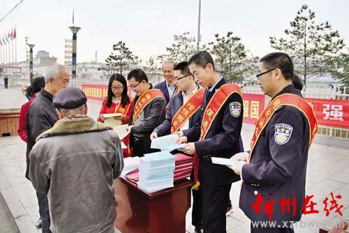 4月15日是全民國家安全教育日,神池縣開展多種形式的宣傳教育活動,在各種公共場所設(shè)立宣傳專欄,在縣人民廣場進行安全法宣傳教育。圖為當(dāng)天上午,縣國家安全領(lǐng)導(dǎo)小組辦公室工作人員走上街頭向過往市民散發(fā)國家安全法宣傳資料。 (楊晉明 詹俊杰 攝)