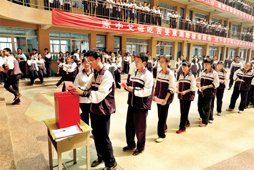 5 月19 日上午,忻州市第一中學師生利用課間操活動時間,參加忻府區(qū)換屆選舉教育選區(qū)選舉區(qū)人大代表的投票活動。圖為學生們將填寫好的選票投入投票箱。(魯明強 攝)