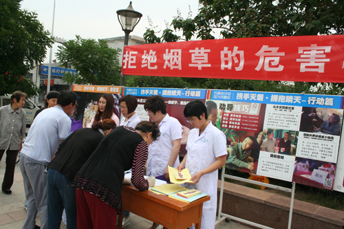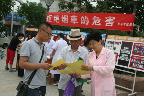 5月31日是“世界無(wú)煙日無(wú)煙日“原平市組織有關(guān)人員開(kāi)展多種形式的宣傳創(chuàng)建無(wú)煙環(huán)境,提醒市民認(rèn)識(shí)吸煙者影響身體健康和污染環(huán)境的危害性。(趙月仁 攝)