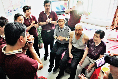 7月2日,原平市新原鄉(xiāng)集中供養(yǎng)敬老院里歌聲飛揚(yáng),原平佳藝藝術(shù)團(tuán)和口琴聯(lián)盟會(huì)給這里的老人們送上了一道文化大餐。原平市加強(qiáng)養(yǎng)老服務(wù),在各鄉(xiāng)鎮(zhèn)建設(shè)養(yǎng)老院,使老年人老有所依、老有所養(yǎng),社會(huì)團(tuán)體和群眾藝術(shù)團(tuán)經(jīng)常送文化、送藝術(shù)到養(yǎng)老院,豐富了老人們的文化生活。圖為志愿者為老人獻(xiàn)唱。(吉建平 攝)