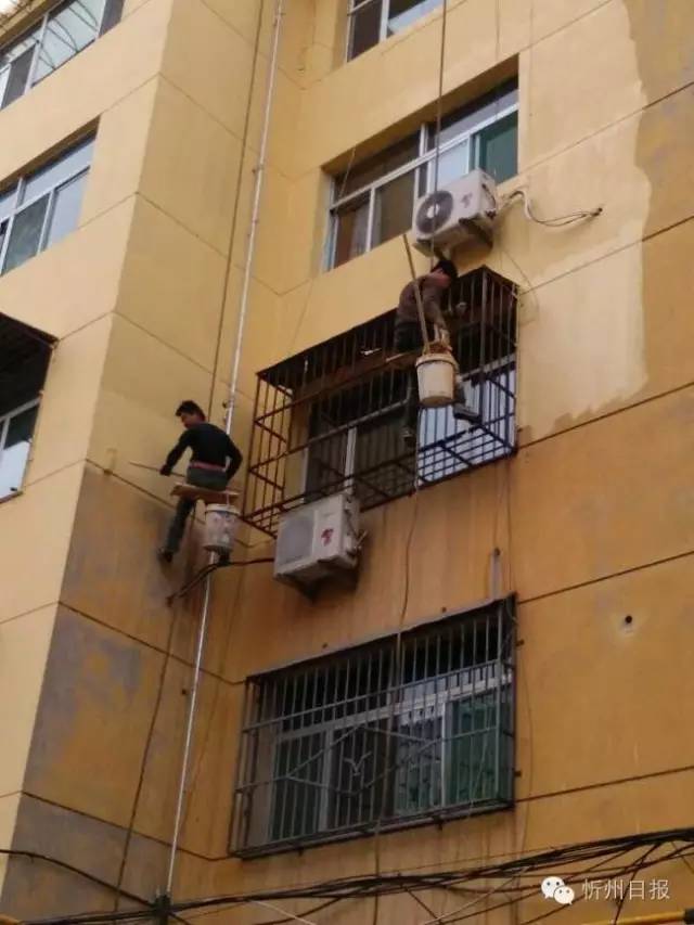 〝蜘蛛俠〞為城市換靚裝。10月28日,兩名工人在忻州城區(qū)忻師西巷接待處宿舍區(qū)高空作業(yè)為樓房粉刷涂料。(魯明強(qiáng) 攝)