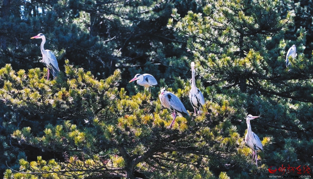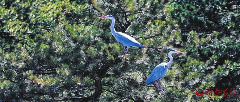 蒼鷺筑巢頗為講究,專挑高大樹木頂端,細(xì)樹枝橫豎交錯(cuò)搭成盆狀。鎮(zhèn)海寺及周邊有530株樹齡在150—1000年的油松,入選“全國(guó)100個(gè)最美古樹群”,是蒼鷺理想的棲息地。一年又一年,不斷有雛鳥在“咯咯”的啼叫聲中平安長(zhǎng)大,蒼鷺家族由最初的幾只壯大到了現(xiàn)在的上百只。