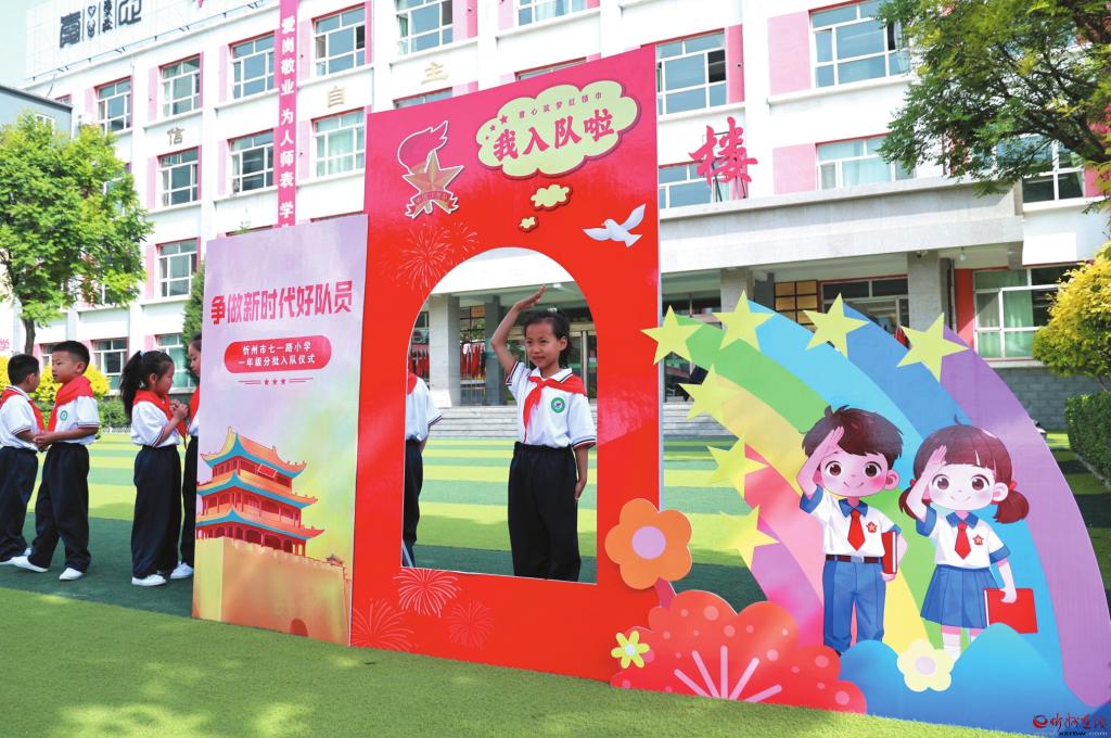 5月7日,忻州市七一路小學(xué)舉行“紅領(lǐng)巾愛祖國”一年級分批入隊(duì)儀式。此次入隊(duì)儀式不僅是孩子們邁向成長的重要起點(diǎn),也是他們?nèi)松械囊粋€重要時刻。新隊(duì)員們將牢記紅領(lǐng)巾的責(zé)任,賡續(xù)紅色精神,用實(shí)際行動爭做新時代好隊(duì)員。圖為新隊(duì)員拍照留念。 (記者 張存良攝)