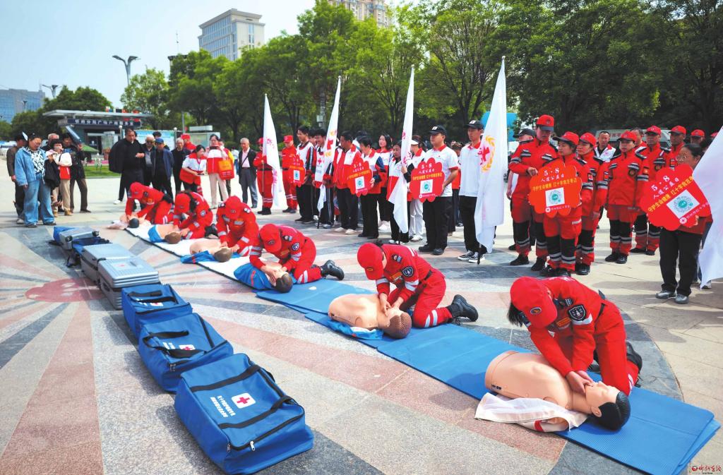 5月8日,忻州市紅十字會在忻州城區(qū)體育廣場舉行紀(jì)念“5·8世界紅十字日”暨“紅十字博愛周”宣傳活動。圖為救援隊員進(jìn)行救護(hù)演練。(記者 張存良攝)