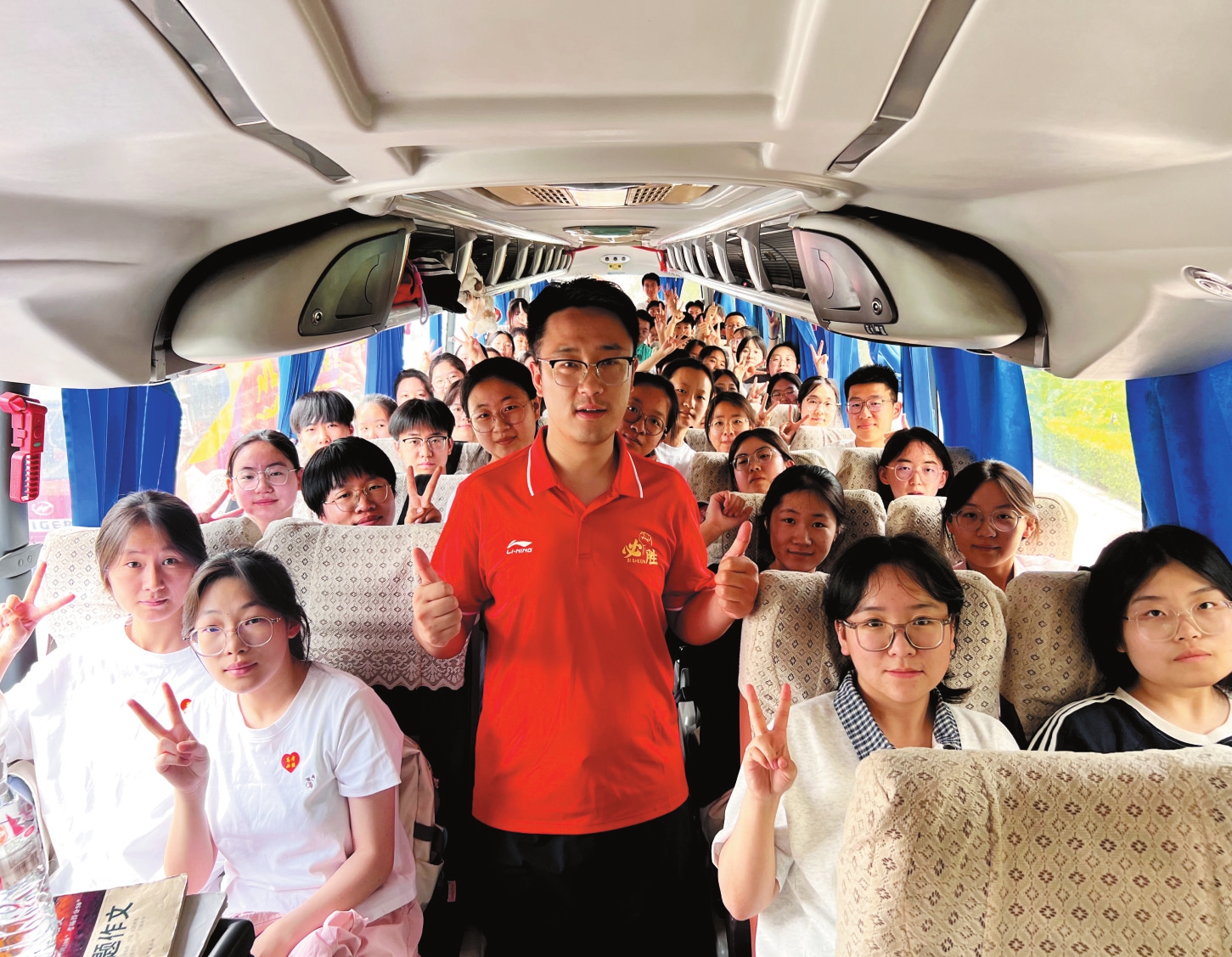 圖為第一場考試結(jié)束后,忻州實驗中學(xué)送考車上,師生互相鼓勁加油。趙臻宇攝