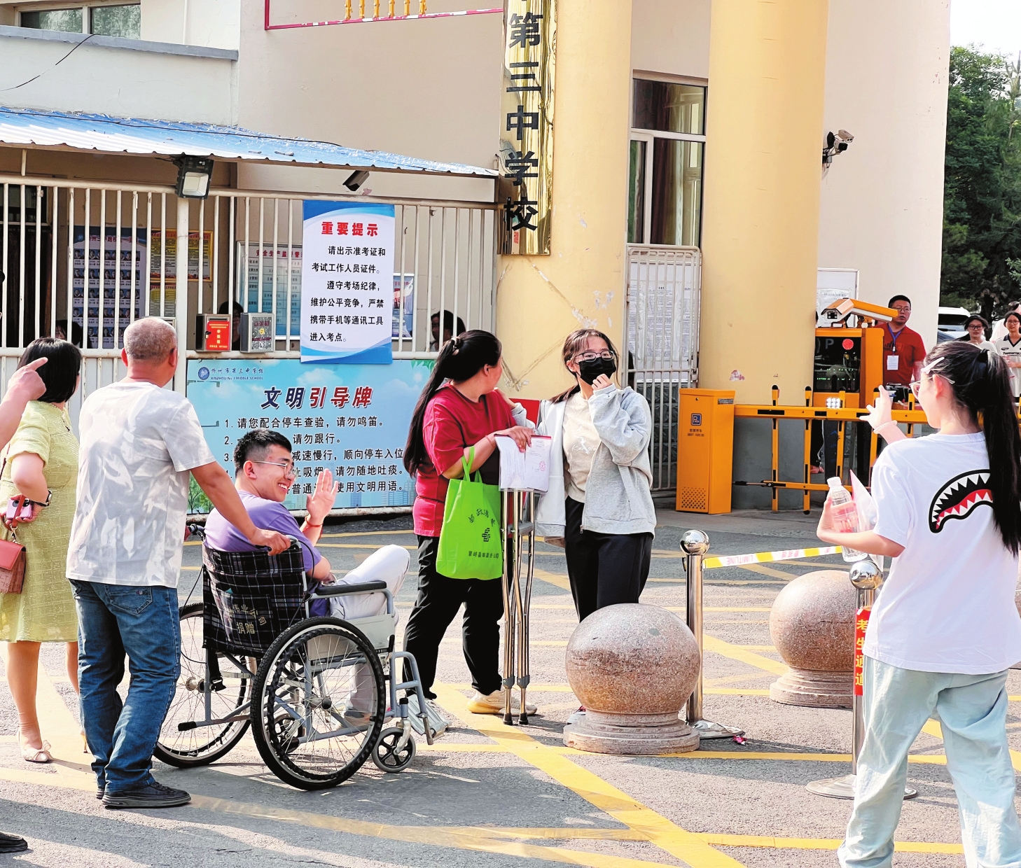 圖為忻州三中考點,行走不便的考生在跟同學(xué)打招呼。趙臻宇攝