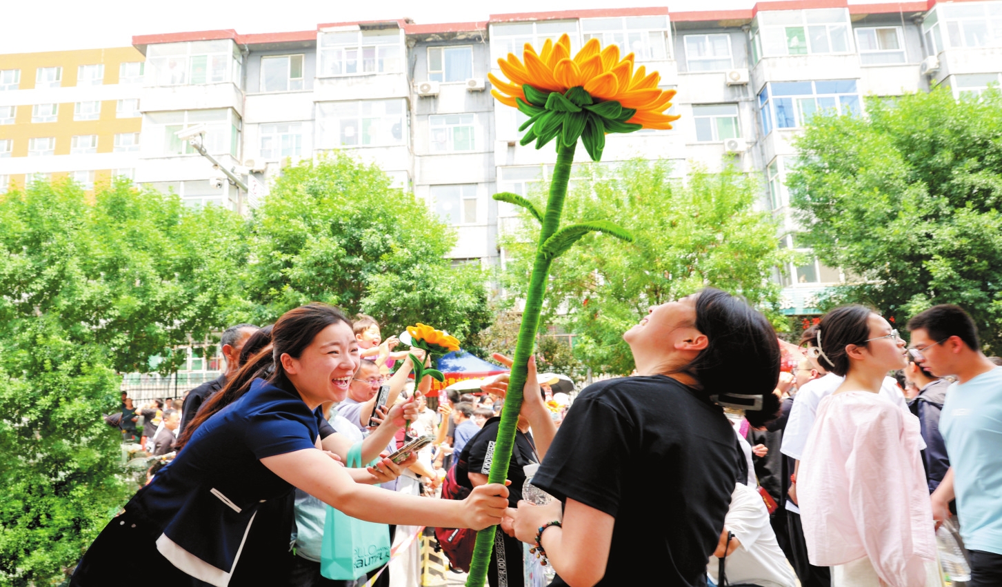圖為忻州七中考場外,一名考生的姐姐在妹妹走出考場時送上一朵特大號向日葵,祝妹妹“一舉奪魁”。范琛攝