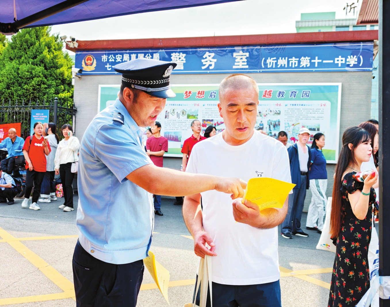 圖為忻州十一中考點,民警在宣傳防范電信詐騙知識。馮偉倫攝