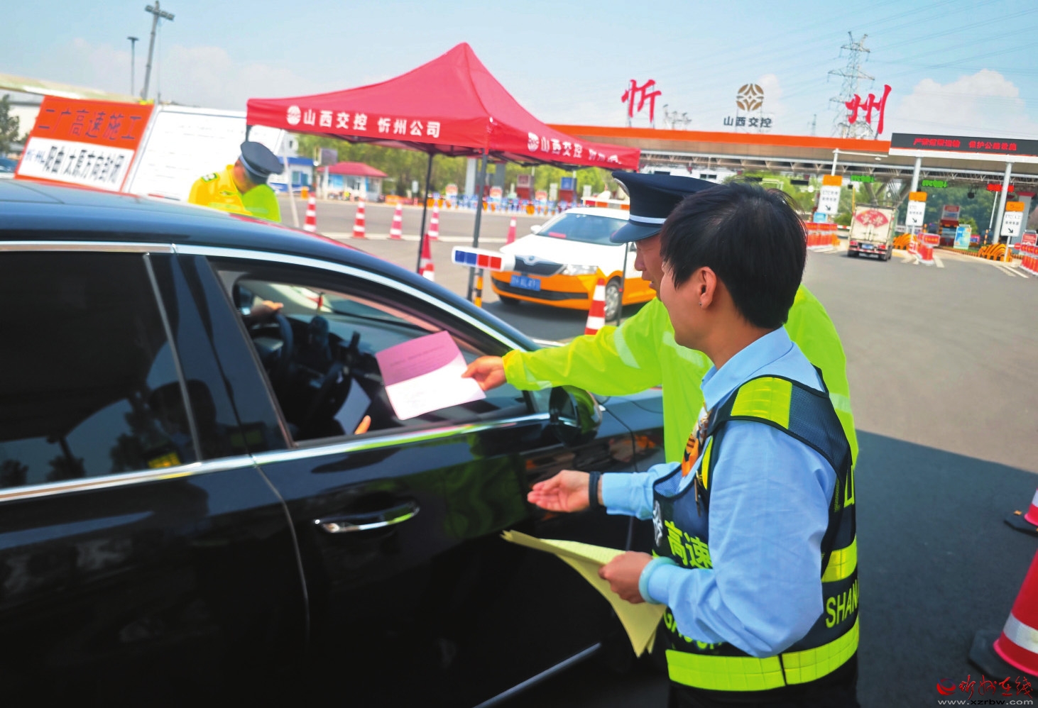 圖為工作人員向過往司乘人員發(fā)放宣傳資料。