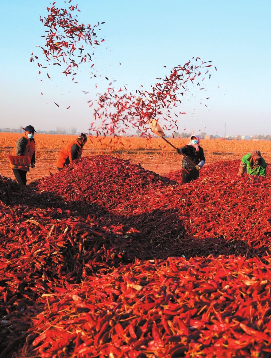 彼時(shí),農(nóng)家院落也成了豐收“展示廳”:屋檐下玉米辮與紅辣椒相映成趣,晾曬場(chǎng)上谷物、干果鋪展成金色“地毯”,地窖中土豆、白菜碼放整齊。