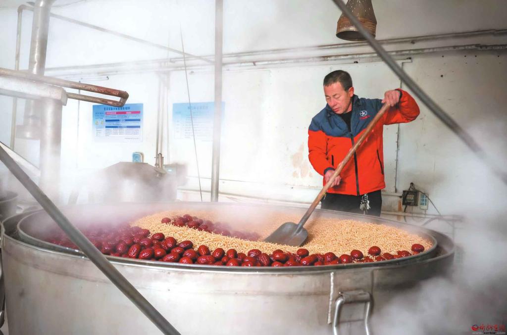 近年來(lái),保德縣貢棗酒開發(fā)基地以“保德油棗”與枸杞入酒,不僅更好地保留了果實(shí)的溫補(bǔ)特性,也釀出了獨(dú)特的地方風(fēng)味。該基地不僅是當(dāng)?shù)赝苿?dòng)紅棗產(chǎn)業(yè)深加工、提升附加值的關(guān)鍵項(xiàng)目,也是將地理標(biāo)志農(nóng)產(chǎn)品轉(zhuǎn)化為特色商品、助力鄉(xiāng)村振興的生動(dòng)實(shí)踐。圖為保德縣貢棗酒基地,工人在蒸餾車間翻動(dòng)攪拌麥殼與紅棗等原料,車間內(nèi)蒸汽彌漫。(記者 范琛攝)