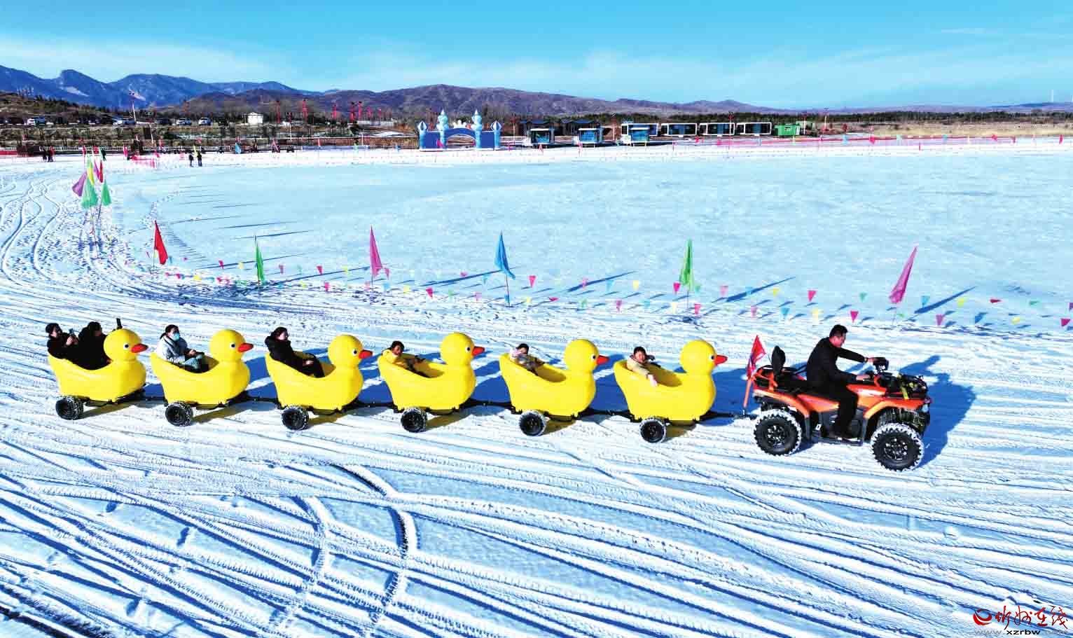 近日,寧武縣鴨子海冰雪大世界內紅火熱鬧,一片歡樂景象。圖為冰面上,游客們盡情享受著冰雪項目帶來的樂趣。(