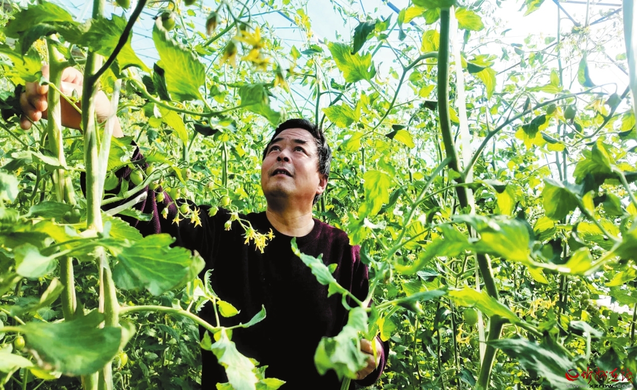 武文光察看圣女果長(zhǎng)勢(shì)。本報(bào)記者 劉 捷攝
