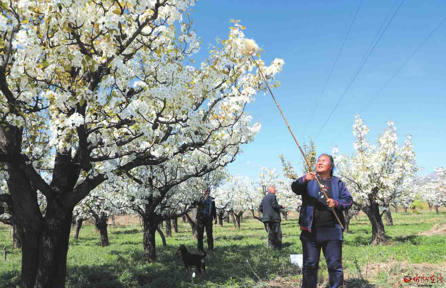 4月18日,原平市同川鎮(zhèn)萬畝梨園迎來盛花期,果農(nóng)緊抓晴好天氣開展人工授粉作業(yè),通過精準(zhǔn)點(diǎn)授提升坐果率,為秋季豐產(chǎn)奠定基礎(chǔ)。(褚 震攝)