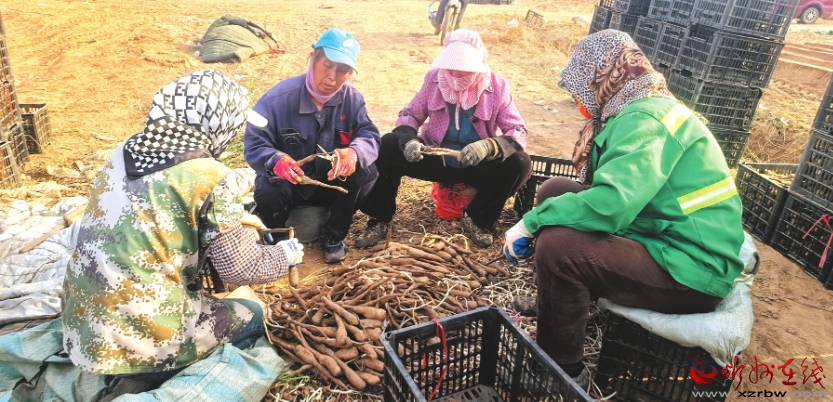 小奇村村民對長山藥種條進行修整。