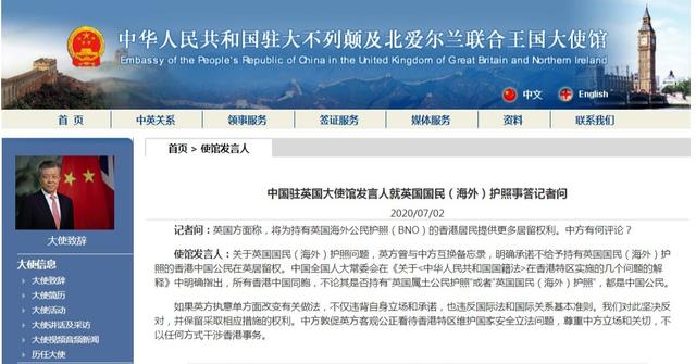 當地時間7月2日,中國駐英國大使館發(fā)言人就英國國民(海外)護照事答記者問時表示,關于英國國民(海外)護照問題,英方曾與中方互換備忘錄,明確承諾不給予持有英國國民(海外)護照的香港中國公民在英居留權。中國全國人大常委會在《關于〈中華人民共和國國籍法〉在香港特區(qū)實施的幾個問題的解釋》中明確指出,所有香港中國同胞,不論其是否持有“英國屬土公民護照”或者“英國國民(海外)護照”,都是中國公民。