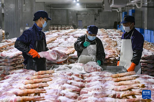 11月6日,在浙江省金華金年火腿有限公司車間內,技師在腌制火腿。(新華社發(fā) 時寬兵 攝)