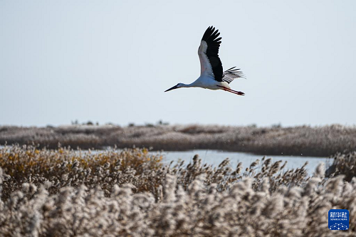 11月13日,在黃河三角洲國家級自然保護區(qū),白鸛在飛翔。(新華社記者 朱崢 攝)