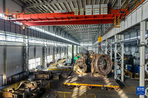 11月20日,在甘肅省酒泉經濟技術開發(fā)區(qū)的日月重工(甘肅)有限公司機加車間,工作人員操作起重機轉運風機輪轂(無人機照片)。(新華社記者 郎兵兵 攝)