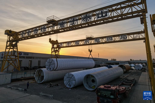 11月20日,在甘肅省酒泉經濟技術開發(fā)區(qū)的中國水電四局(酒泉)新能源裝備有限公司裝運生產線上,工作人員進行風機塔筒吊裝作業(yè)(無人機照片)。(新華社記者 郎兵兵 攝)