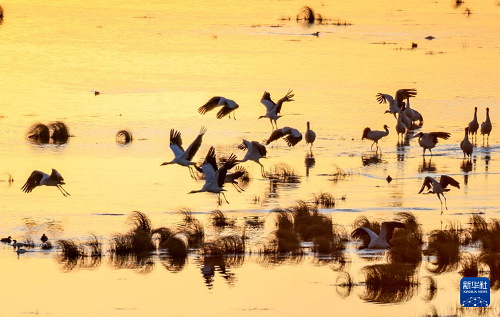 11月29日,黑頸鶴在大山包黑頸鶴國家級自然保護(hù)區(qū)內(nèi)的大海子濕地飛舞。(新華社發(fā) 陳熙 攝)