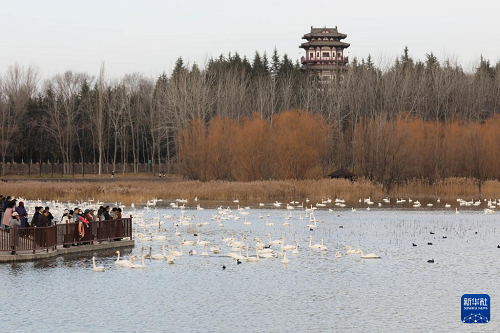 12月20日,游客在河南省三門峽市天鵝湖國家城市濕地公園觀賞天鵝。(新華社發(fā) 何五昌 攝)