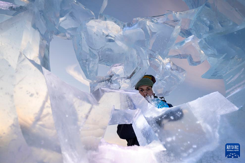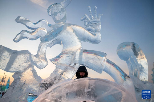 1月3日,參賽選手在哈爾濱冰雪大世界園區(qū)內(nèi)進行冰雕創(chuàng)作。(新華社記者 張濤 攝)