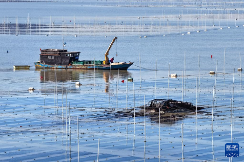 1月8日,漁民在江蘇連云港市海州灣漁場(chǎng)養(yǎng)殖區(qū)收獲條斑紫菜(無(wú)人機(jī)照片)。(新華社發(fā) 王健民 攝)