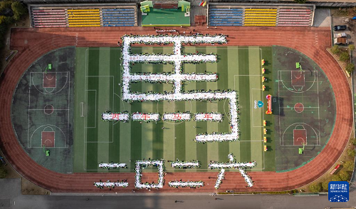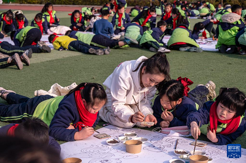 1月14日,榮縣樹人小學(xué)校的學(xué)生們在畫布上畫馬(無人機(jī)照片)。(新華社發(fā) 何海洋 攝)