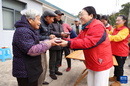 1月25日,在浙江省舟山市定海區(qū)摘箬山島,志愿者為老人們送上臘八粥。(新華社發(fā) 陳永建 攝)