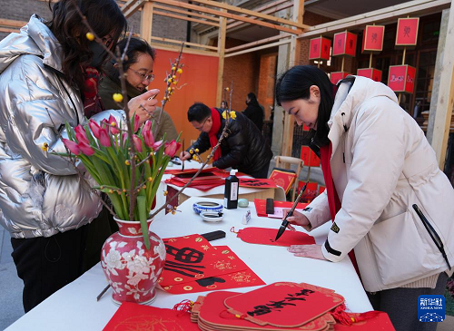 2月8日,書(shū)法家們?cè)谟螆@會(huì)上為市民寫(xiě)春聯(lián)和福字。(新華社記者 劉穎 攝)