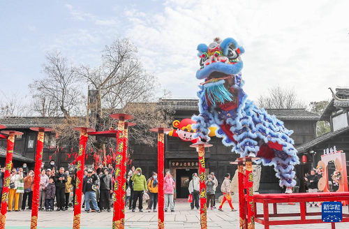 2月23日,游客在江蘇省句容市寶華山國家森林公園觀看舞獅表演。(新華社發(fā) 鐘學(xué)滿 攝)
