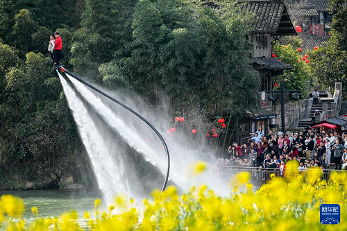 2月23日,游客在貴州省遵義市烏江寨景區(qū)體驗(yàn)“水上飛人”項(xiàng)目。(新華社發(fā) 袁福洪 攝)