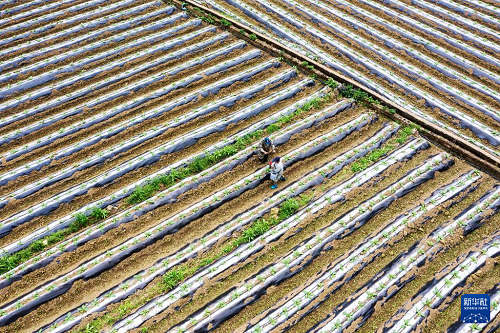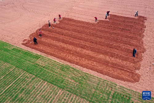 2月25日,河南省沁陽市王曲鄉(xiāng)東王曲村,農(nóng)民在田間整地作畦(無人機(jī)照片)。(新華社發(fā) 楊帆 攝)