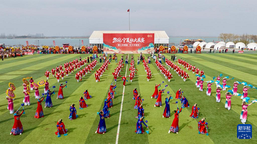 3月1日,在寧夏銀川市覽山公園,演員在熱場節(jié)目中表演。(新華社記者 楊植森 攝)