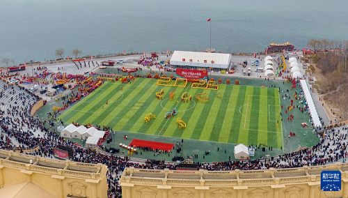 3月1日,在寧夏銀川市覽山公園,參賽社火隊(duì)的演員在比賽中(無人機(jī)照片)。(新華社記者 馬思嘉 攝)