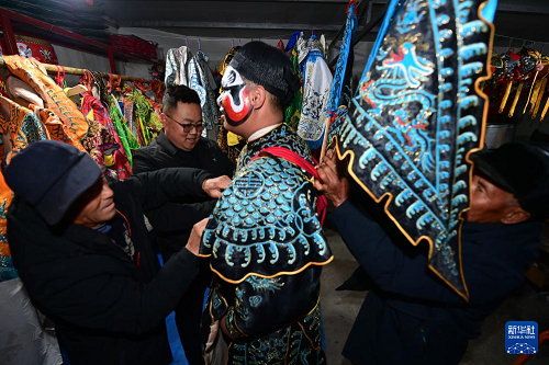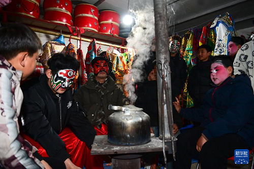 3月2日,隴縣黃花峪村社火隊(duì)隊(duì)員在相互交流。(新華社記者 鄒競一 攝)