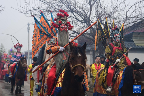 3月2日,隴縣黃花峪村社火隊(duì)在游演途中。(新華社記者 鄒競一 攝)