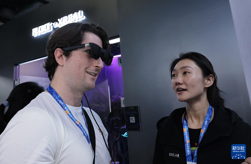 3月12日,參觀者(左)在東方樞紐展區(qū)現(xiàn)場(chǎng)體驗(yàn)一款智能眼鏡產(chǎn)品。(新華社記者 方喆 攝)