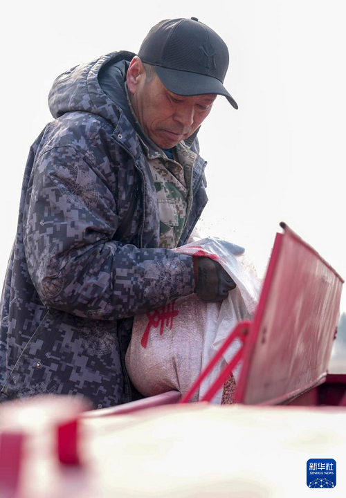 3月25日,農(nóng)戶在位于黑龍江省哈爾濱市的北大荒集團(tuán)閆家崗農(nóng)場(chǎng)有限公司一處地塊將麥種加入播種機(jī)中。(新華社記者 王松 攝)