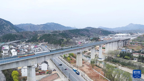 3月29日,檢測列車駛過中鐵二十局承建的西十高鐵南秦河特大橋(無人機照片)。(新華社發(fā) 郭晨 攝)