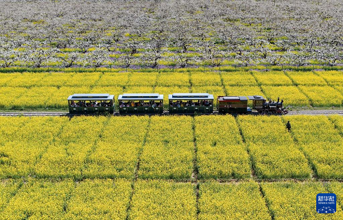 4月6日,游客乘觀光小火車從河北省晉州市周家莊鄉(xiāng)第九生產(chǎn)隊(duì)梨園旁經(jīng)過(無人機(jī)照片)。(新華社記者 楊世堯 攝)