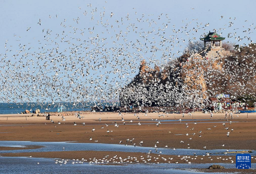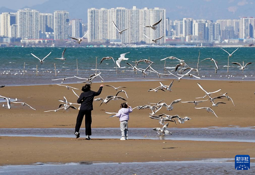 4月7日,游客在河北省秦皇島市北戴河區(qū)沿海地區(qū)觀看海鷗飛舞。(新華社記者 楊世堯 攝)
