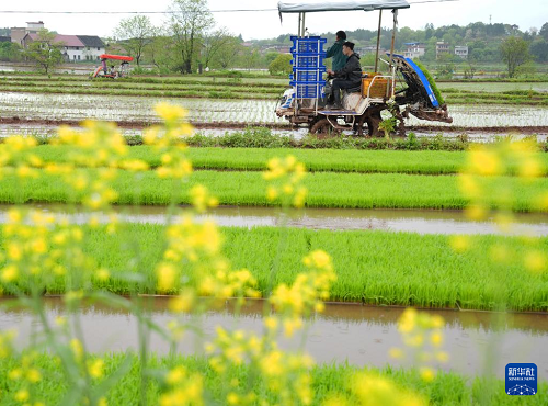 4月11日,湖南省衡陽市祁東縣金橋鎮(zhèn)村民駕駛插秧機(jī)進(jìn)行早稻插秧工作。(新華社發(fā) 曹正平 攝)