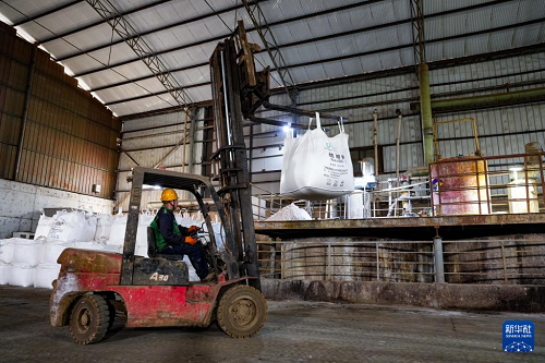 4月13日,在金昌神泥科技有限公司原料倉,工作人員進行廢渣投料作業(yè)。(新華社記者 郎兵兵 攝)