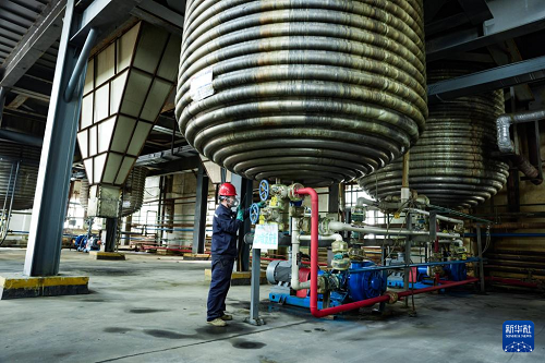 4月13日,在金昌高能環(huán)境技術(shù)有限公司濕法車間,工作人員進行浸出作業(yè)。(新華社記者 郎兵兵 攝)