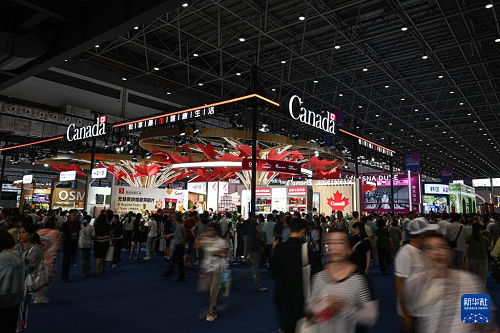 4月16日,第六屆消博會加拿大國家館所在的全球特色消費展區(qū)人頭攢動。加拿大是本屆消博會主賓國。(新華社記者 蒲曉旭 攝)