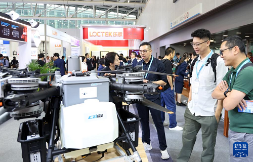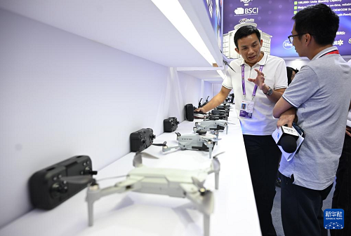 4月15日,采購商在廣交會(huì)現(xiàn)場參觀選購無人機(jī)。(新華社記者 盧漢欣 攝)