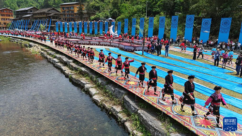4月19日,在廣西桂林市龍勝各族自治縣龍脊鎮(zhèn)金江村黃洛瑤寨,當(dāng)?shù)厝罕妳⒓印癟臺(tái)秀”(無(wú)人機(jī)照片)。(新華社發(fā) 韋吉陽(yáng) 攝)